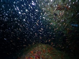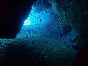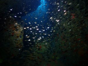 洞窟の中も魚でいっぱい。視界をふさがれるほどの密度でした