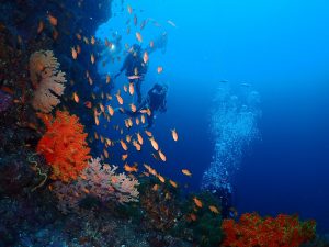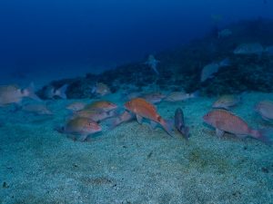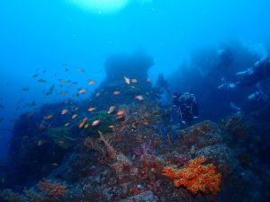 水深40mから垂直に立ち上がるでっかい奇岩のまわりにハナダイが群れるダイナミックな水中景観!