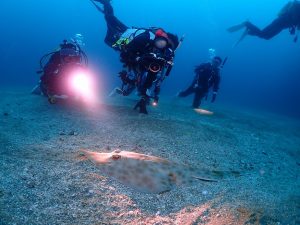 砂地では集会中のホウライヒメジとレアものサカタザメ